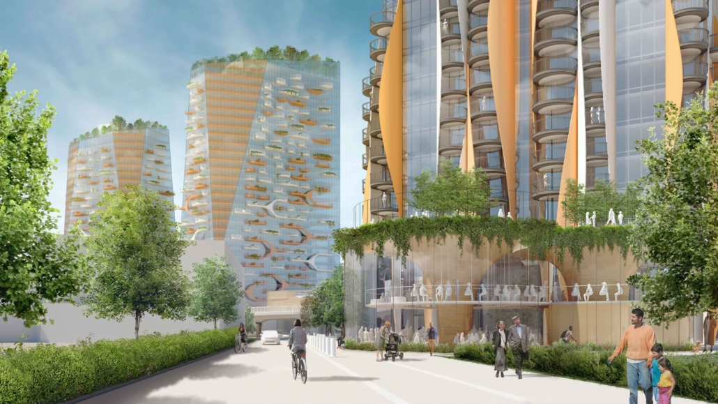 The project, which includes towers ranging from 17–59 stories, will maximze the use of the narrow srip of land, set to be a car-free development. The conceptual drawings featuring curvilinear balconies overflowing with greenery and reflecting the surrounding environment were done in close consultation with the Squamish Nation and include Indigenous art and design elements from façades to structural core surfaces to suite entry doors and benches.