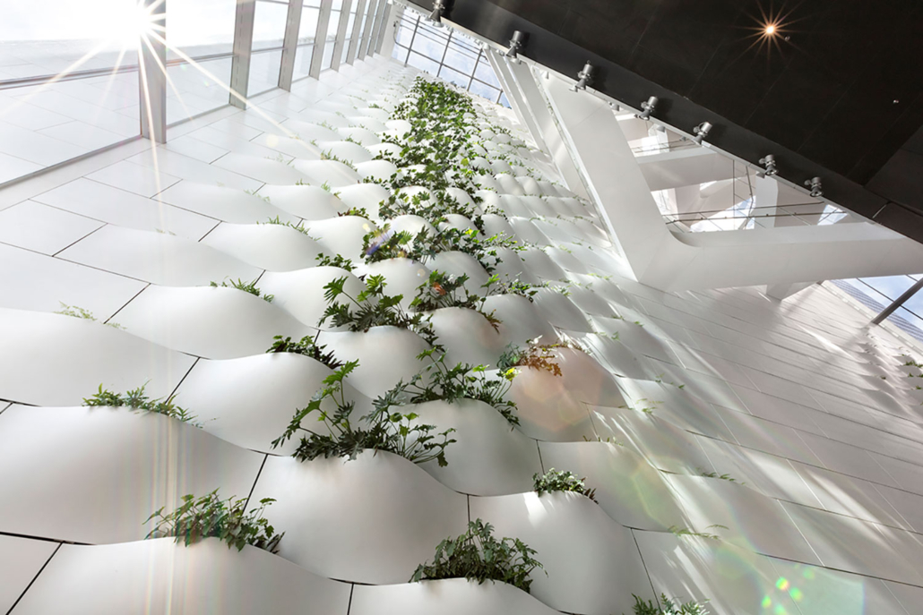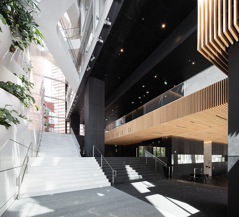 In addition to providing building code consulting services, LMDG used computer simulations to develop a performance-based design for the 12-storey atrium, including the provision of glazed separations to the adjoining office floors, connecting circulation stairs and a green wall.