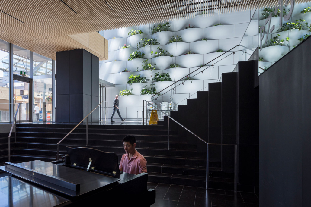 The project features a storm water management system to recycle rainwater for washroom toilets and outdoor irrigation, reducing water use by millions of litres per year. An LED public art lighting installation illuminates colourful sequences with countless variations along the 700 square foot surface at night.